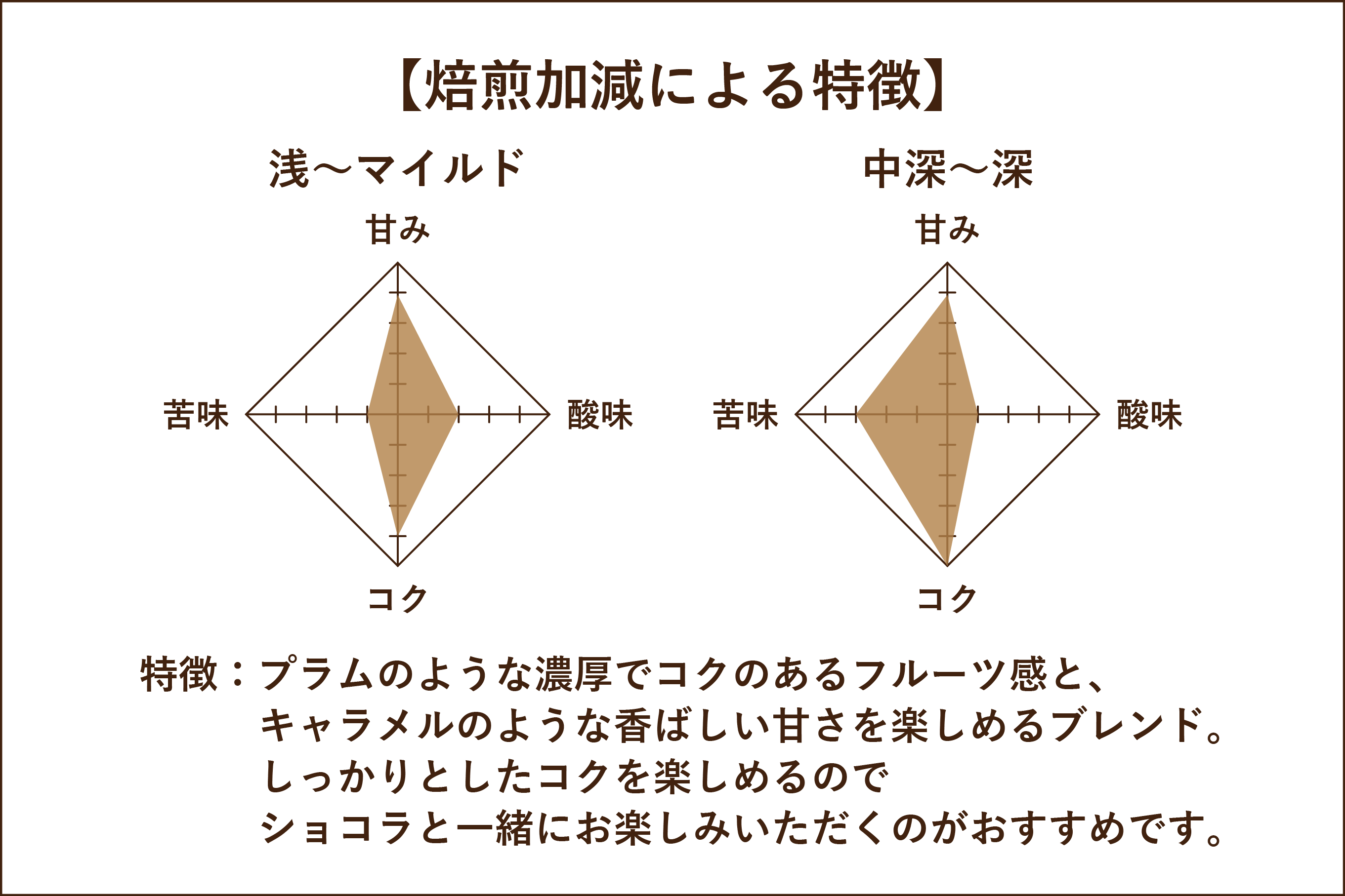 やや深煎りから、甘さとコクが引き出され、ビター系のチョコレートと相性バツグンに。
