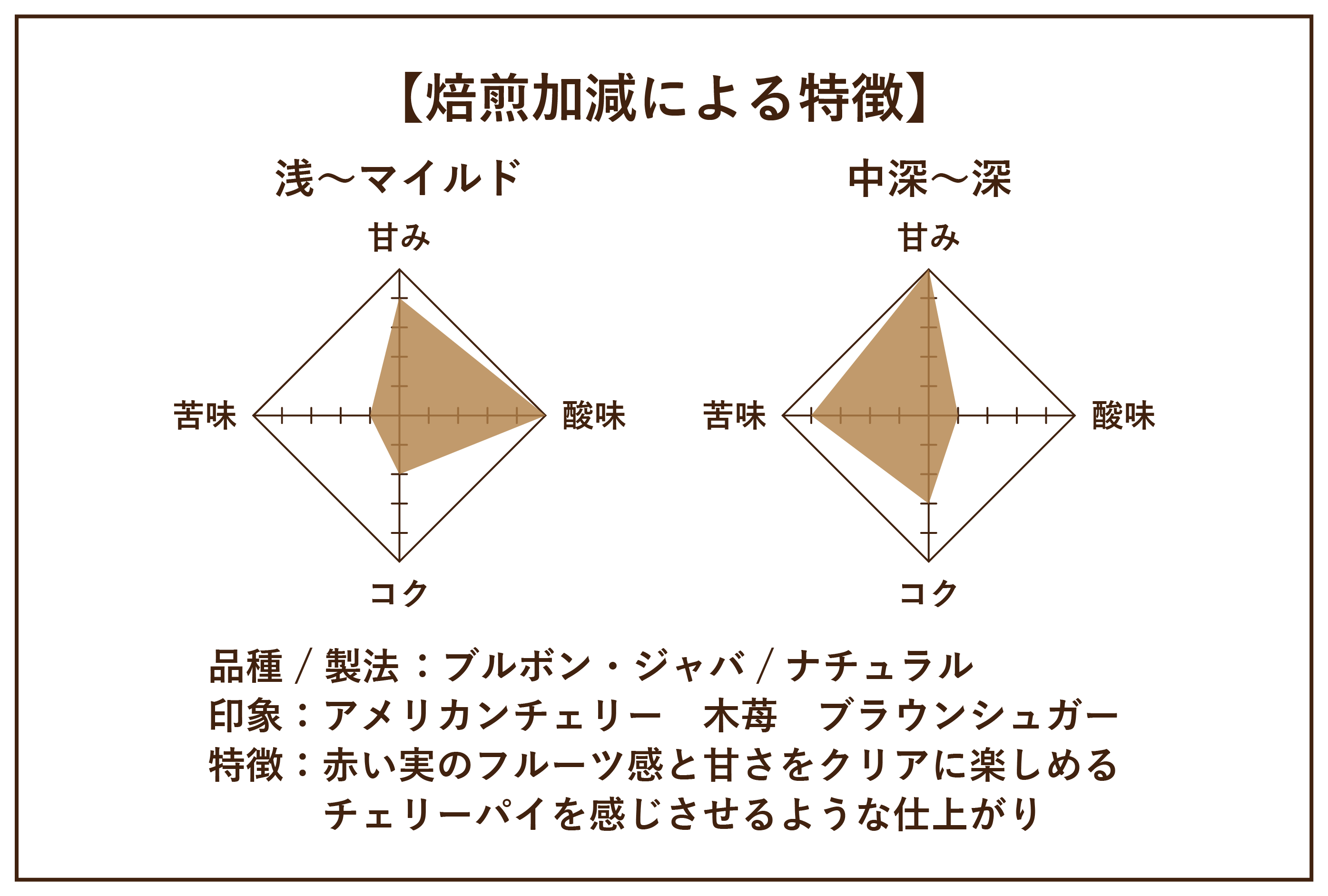 浅煎りではアメリカンチェリーのようなジューシーで鮮やかなフルーツ感が楽しめ、焙煎が深まるほどジャムのような甘さと後味のスッキリ感を、余すことなく楽しむことができます。